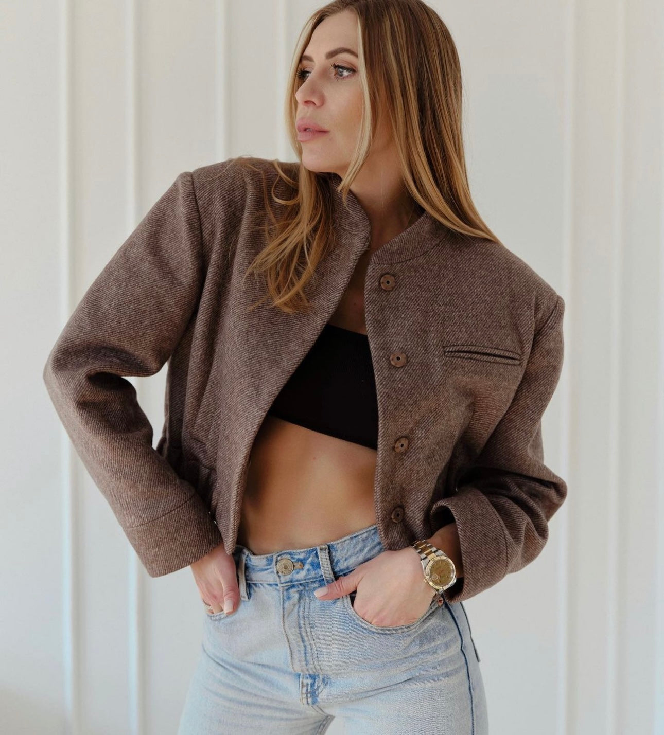 Chocolate brown 100% wool bomber jacket - a captivating fusion of timeless charm and contemporary style. Meticulously crafted, this jacket boasts wool body that guarantees warmth and comfort.